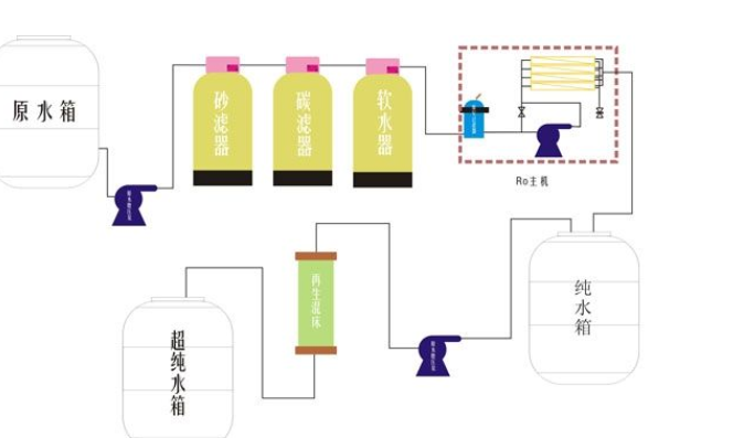 1: 預處理-反滲透-純化水箱-離子交換器-紫外燈-純水泵-用水點