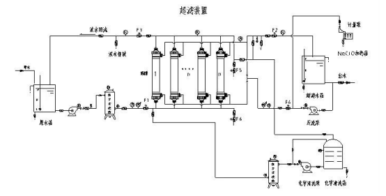 4. 化學清洗系統:化學清洗系統一般由手動閥控制,化學清洗系統由清洗水箱、清洗泵、過濾器和攪拌加熱設備組成。當超濾嚴重污染或跨膜壓差達到最高的標準,化學反洗無法恢復超濾系統性能時,需要停機進行化學清洗。